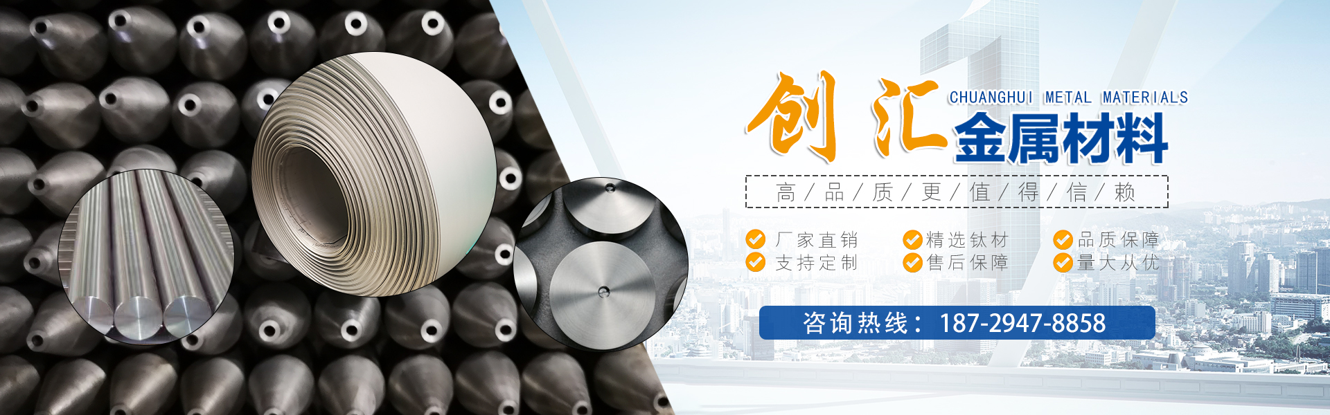 寶雞市創匯金屬材料有限公司,位于有“中國鈦谷”之稱寶雞寶鈦路南段,這里也是國家重點支持和扶持的有色金屬材料資源產業基地,我司專業從事鈦、鋯、鉿、鎳鉻、鎢鉬、鉭鈮、合金材料、復合材料,板、棒、絲、管、箔材等,設備制造,金屬制品機械加工銷售。